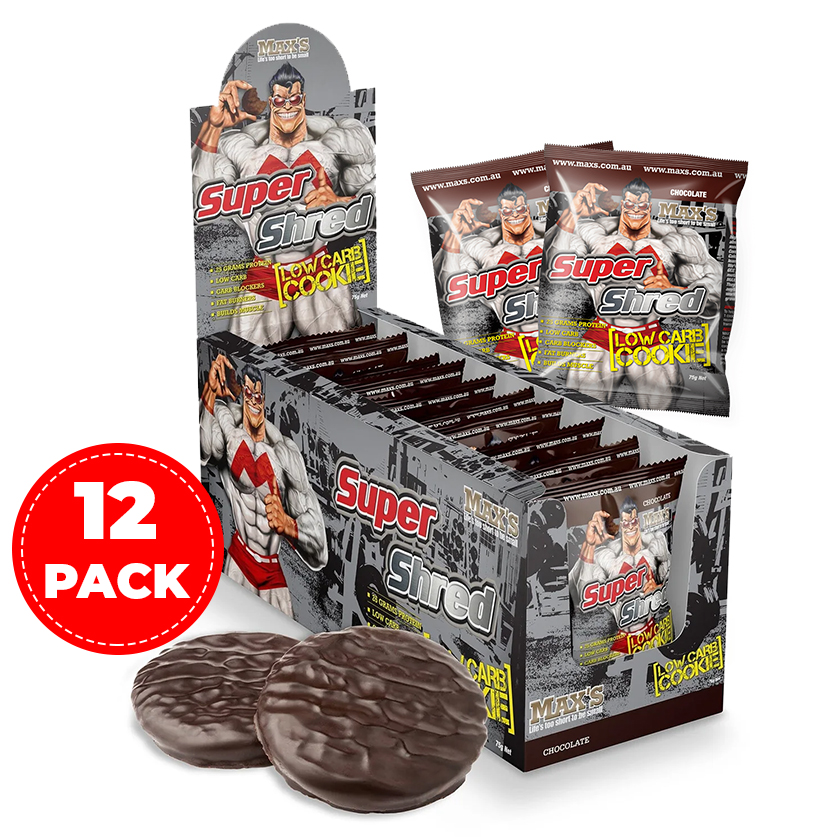 MAX’S Super Shred cookie combines low carbs and blended protein technology with a carb blocking + fat burning complex to bring you the ultimate fat stripping protein snack. The protein blend not only helps to keep you fuller for longer, but drip feeds your muscle over time for maximum recovery and growth. While the low carb level and fat burning complex makes it perfect when you’re on a cutting program.
